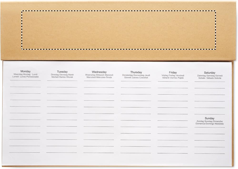 Настольный еженедельник-планер на 125 страниц на 6 языках (EN/DE/FR/ES/IT/NL/PL) с обложкой из крафт-бумаги, картонной ручкой с синими чернилами, деревянной линейкой и блокнотом со стикерами.