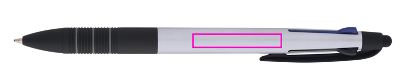 Пластиковая шариковая ручка 4 в 1 с 3 разными цветами письма (синий, красный и черный) + сенсорная функция и прорезиненная зона захвата. Мы напечатаем ваш логотип на стержне.