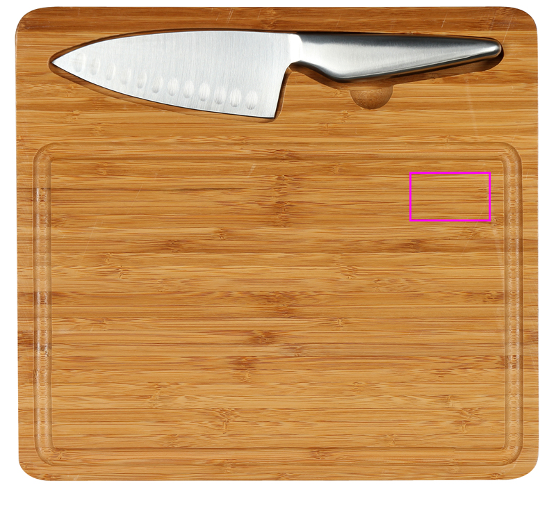 Красивая разделочная доска из бамбука с интегрированным универсальным ножом из нержавеющей стали. Нож фиксируется магнитом в углублении. Наносим ваш логотип методом лазерной гравировки на лезвие ножа.