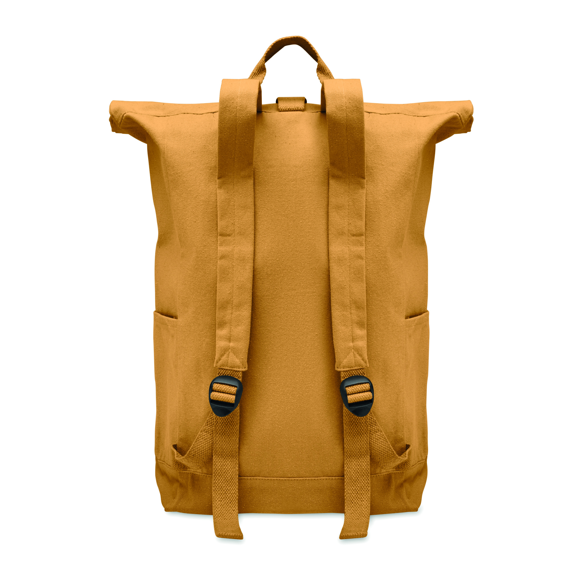 Roll top backpack with hook and loop closure in 390 gr/m² recycled cotton (80%) and recycled polyester (20%). Zippered front pocket.