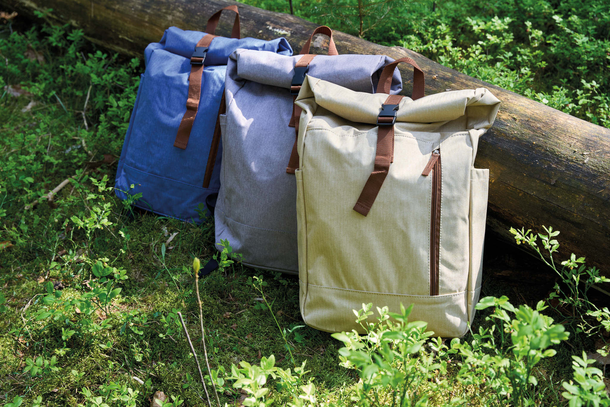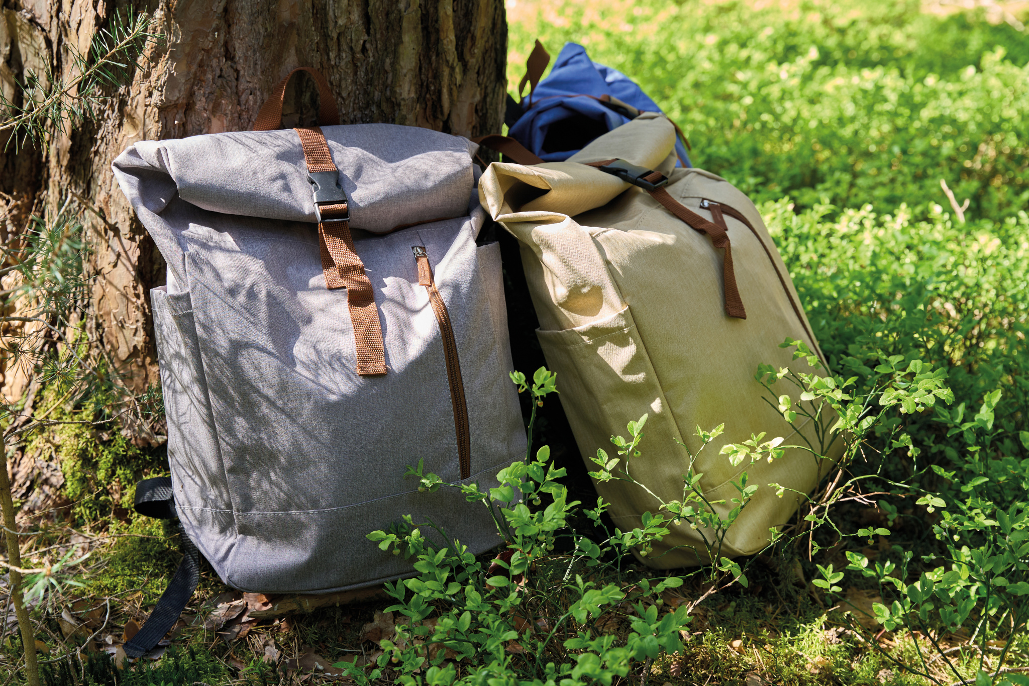 Рюкзак из полиэстера 500D со складной или рулонной застежкой, мягкими ремнями, ручкой для переноски и запирающимся передним отделением. Ваш логотип будет напечатан на переднем отделении.