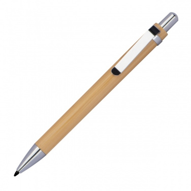 Bläckfri kulpenna av bambu. Blyet är tillverkat av en blandning av grafit och metall, vilket gör det extremt hållbart. Vi lasergraverar din logotyp på höger sida av klämman
