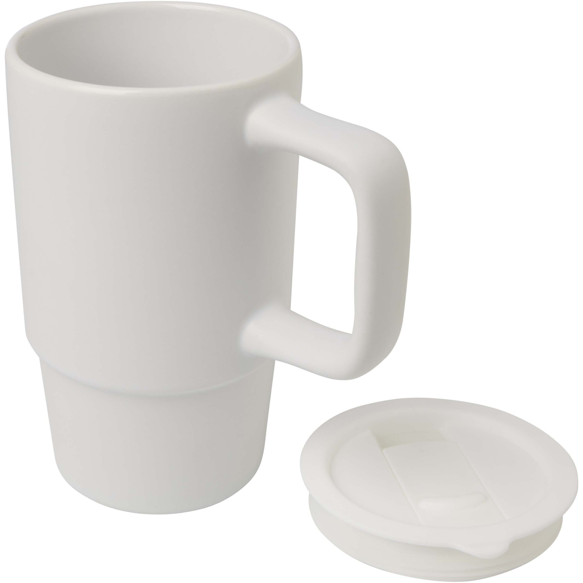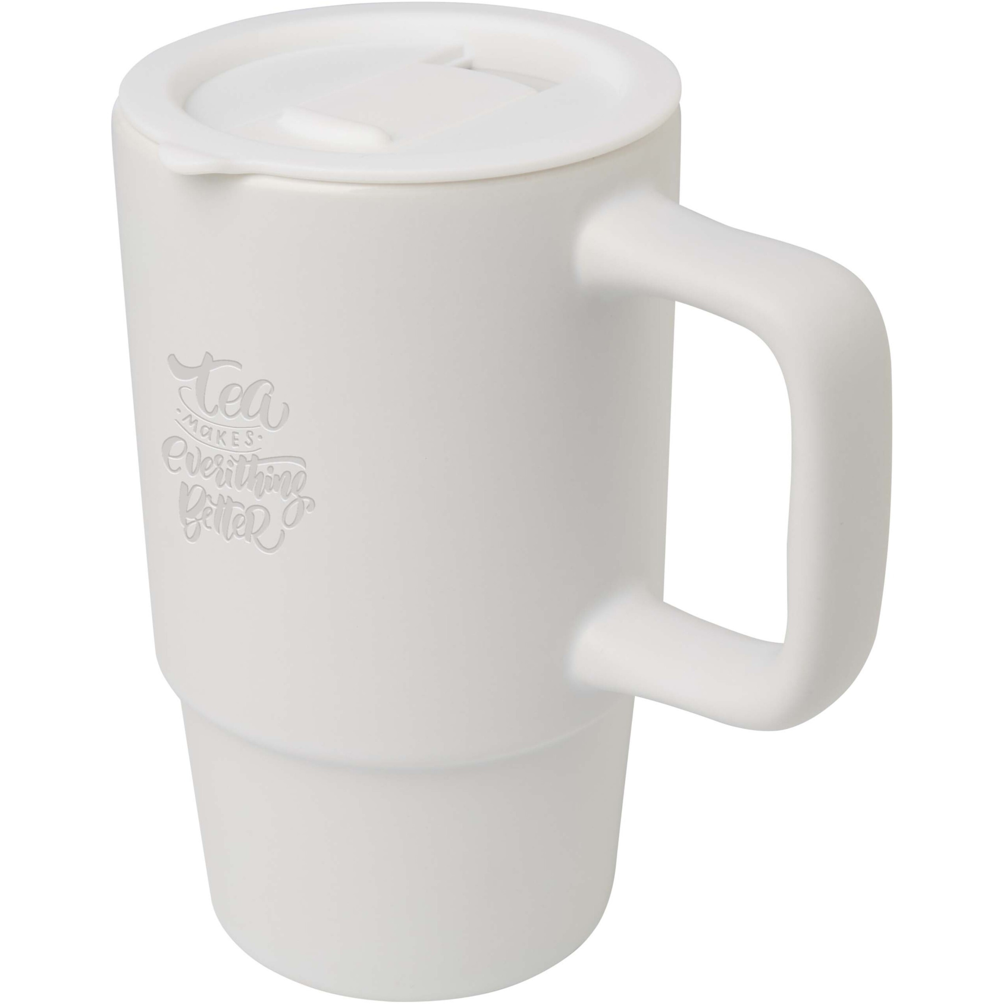 Keramikmugg med stort handtag för enkel transport och spillsäkert plastlock som är praktiskt när du är på språng. Utsidan har en stilig matt finish och flaskan är maskindisksäker för alla tryckmetoder. Levereras i en presentförpackning av återvunnen kartong. Volymkapacitet: 450 ml.