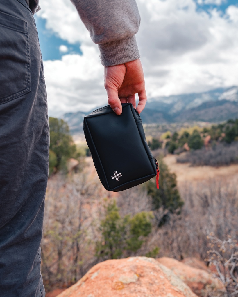 Lyxigt första hjälpen-kit i vattenavvisande nubuck-PU-material som är både snyggt och praktiskt. Materialet är lätt att rengöra och vattenavvisande, vilket gör det perfekt för användning på språng. Innehåll: 1 st PBT-bandage, 1 st PBT- och kompressbandage, 1 st triangelbandage, 1 st mun mot mun-mask, 1 par handskar, 1 st tejp, 3 st säkerhetsnålar, 1 st sax, 10 st plåster och 4 st sårservetter. Allt innehåll enligt direktiven för medicintekniska produkter: 93/42/EEG och EU (2017/745), EN ISO 13485:2016. Allt innehåll (förutom såkerhetsnålar och sax) förpackat i papperspåse märkt med alla obligatoriska märkningar som som krävs för EU-lagstiftning, till exempel Bäst före-datum, CE, LOT-nummer. Totalt återvunnet innehåll: 24% baserat på total produktvikt. RCS certifiering säkerställer en helt certifierad leveranskedja av de återvunna materialen.