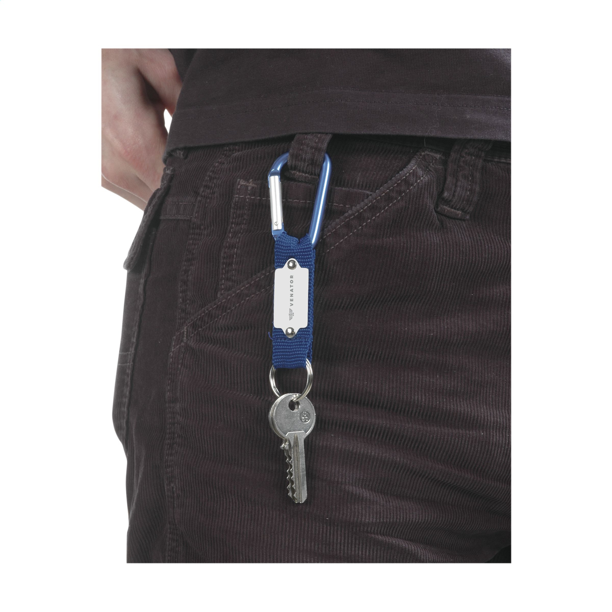 Karbinhake med vävd nylonrem och robust nyckelring.