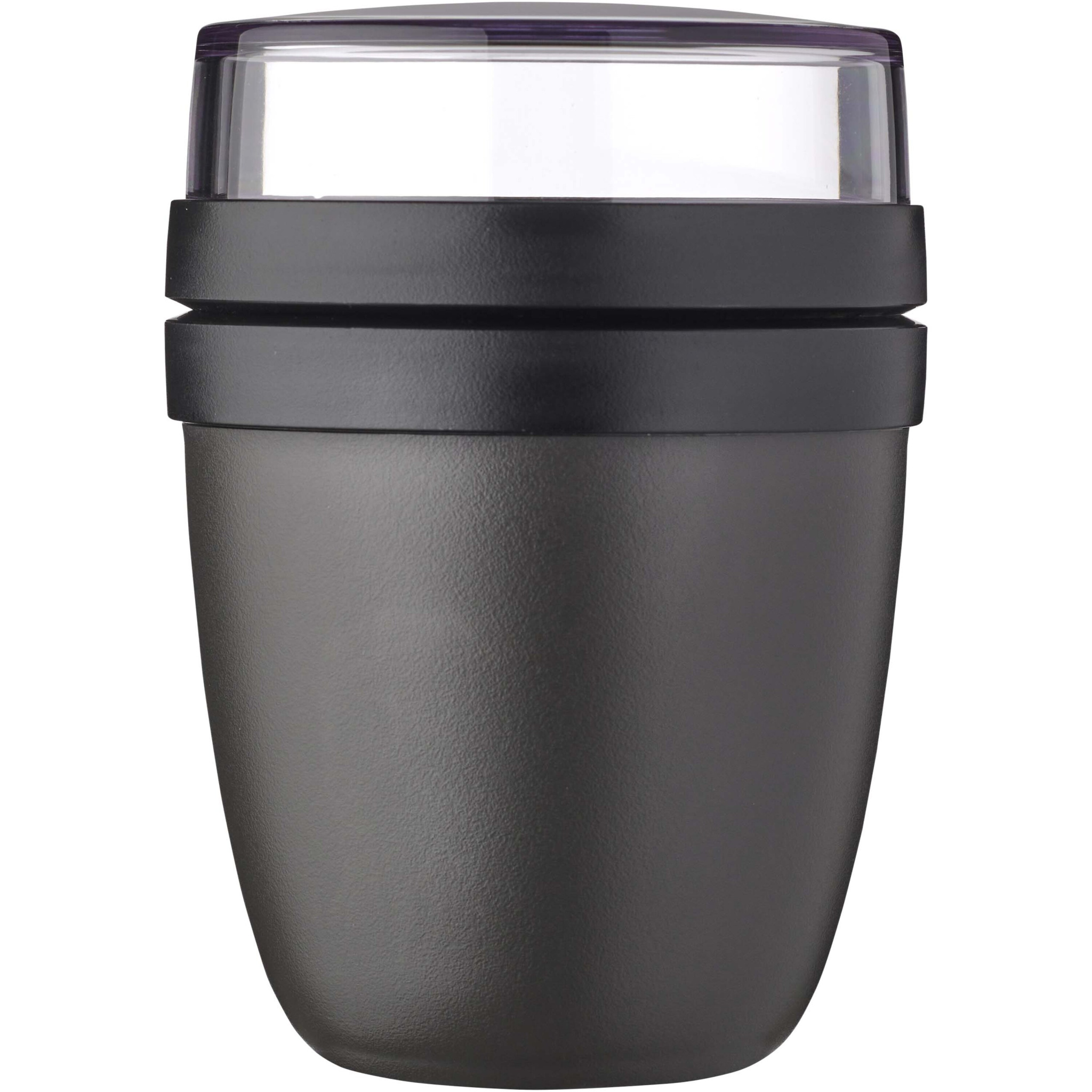 Lunchbägaren Ellipse Mini är perfekt för en mängd olika snacks, t.ex. yoghurt med müsli eller soppa med krutonger. Två smarta fack i en robust behållare håller ingredienserna prydligt åtskilda. Den kompakta storleken gör den perfekt att ta med i väskan för en snabb och smidig måltid. Den övre genomskinliga behållaren rymmer 120 ml, perfekt för ca 50 g müsli eller frukt, och den undre behållaren har en kapacitet på 300 ml. Läckagesäker och maskindisksäker. BPA-fri.