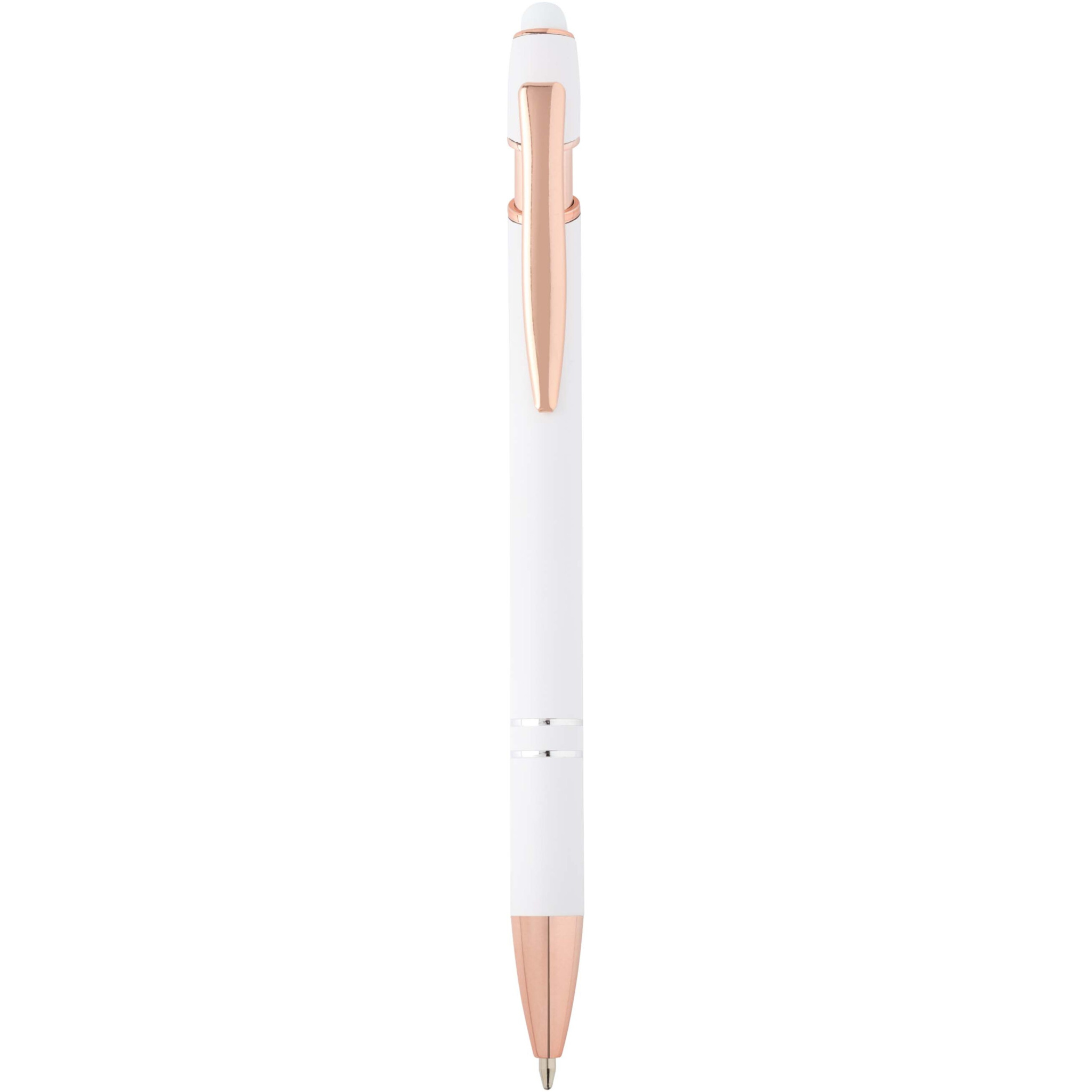 Kulspetspennan Nanna med finish i roséguld har en pennkropp av återvunnen aluminium och en touchpenna av silikon. Det återvunna aluminiumet minskar också mängden avfall i deponier och bidrar till att bevara naturresurser med syftet att minska växthusgasutsläppen. Bläckfärg: Blå. Skrivlängd: 800 meter. NIB-storlek: 1,0 mm.