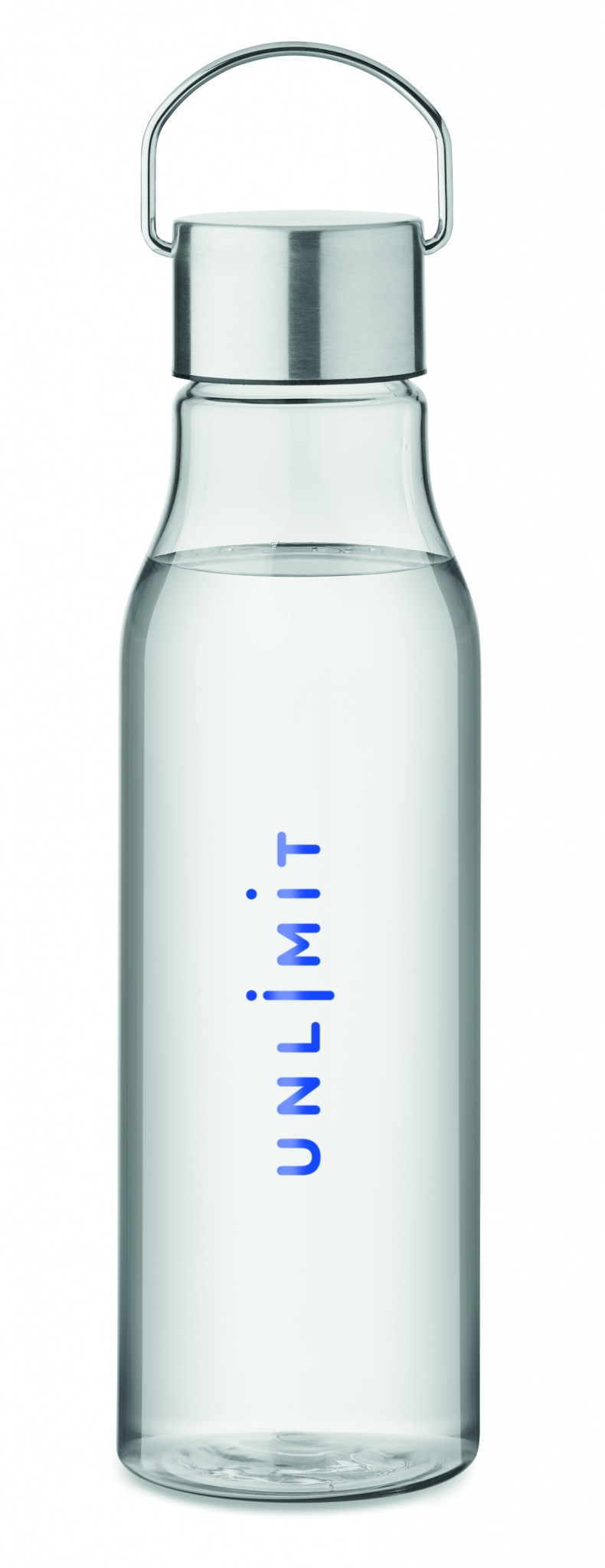 Vattenflaska i RPET som är BPA-fri och lock i rostfritt stål med handtag. Läcker inte. Kapacitet: 600 ml.
