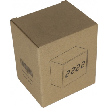 Elegant skrivbordsklocka med träbeläggning, svart displayutrymme och blå LED-bokstäver som visar tid, datum och temperatur turvis. Din logotyp kommer att graveras på toppen.