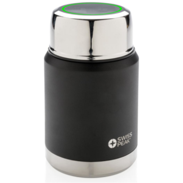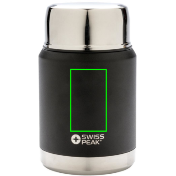 Swiss Peak Elite serien är vakuumisolerad med dubbelväggig 18/8 stainless steel. Den pulverlackerade svarta färgen riskerar inte att falna eller krackelera. Innerväggen är pläterad med koppar för ultimat ledningsförmåga för att hålla varm dryck varm i upp till 8 timmar och kall dryck kall i upp till 24 timmar. Denna mattermos håller din mat varm eller kall hela dagen lång! En 18/8 SS-sked är inkluderad. Endast handdisk. Läckagesäker. Volym 500 ml.