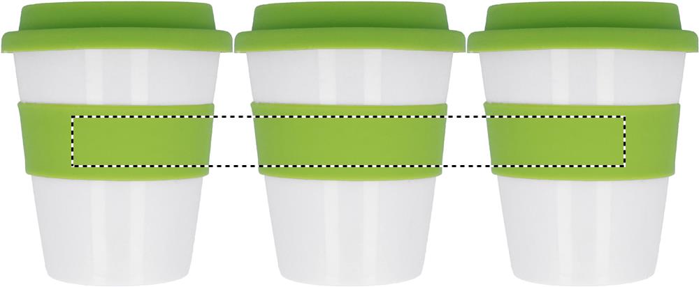 Single wall ''Take away mugg'' tillverkad i blank vit PP med praktiskt lock och värmeisolerande ring på mitten i silikon. Rymmer 350 ml.