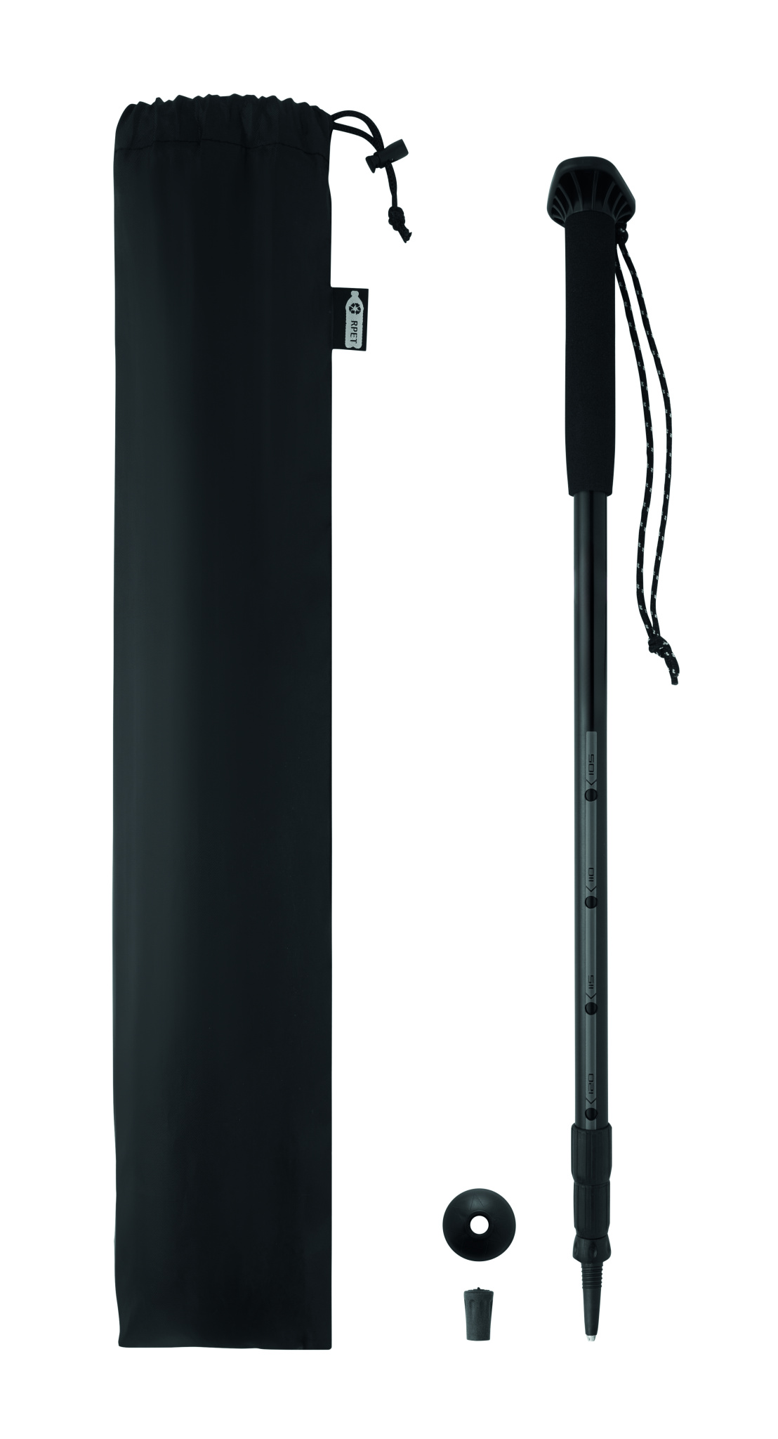 Teleskopisk vandringsstav med EVA-handtag, handledsrem, gummispets och plasttruga. Justerbar från 105 till 120 cm. Förpackad i RPET-påse. Lätt och hållbar design.