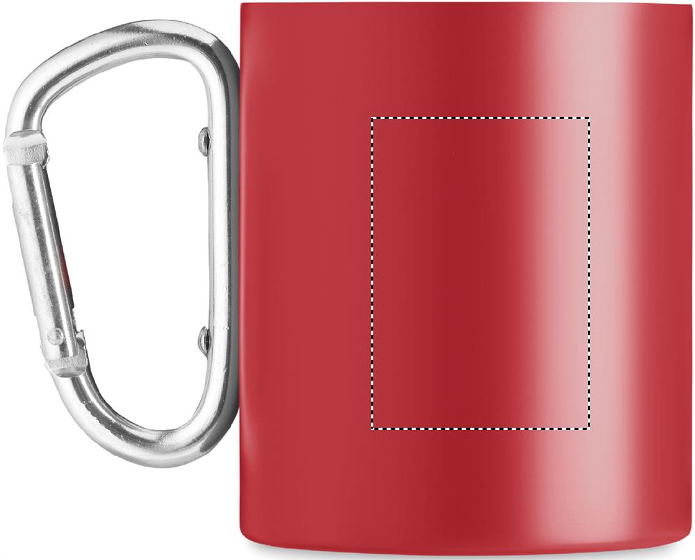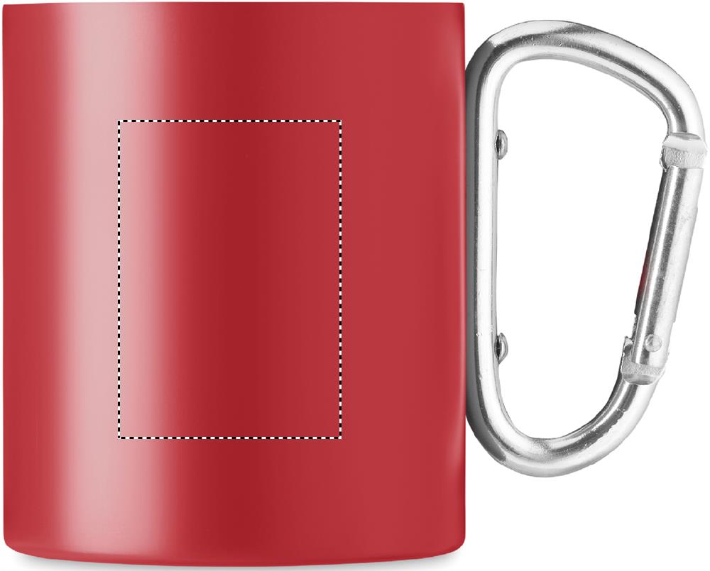 Dubbelväggig mugg i rostfritt stål, med karbinhandtag. Kapacitet: 300 ml.