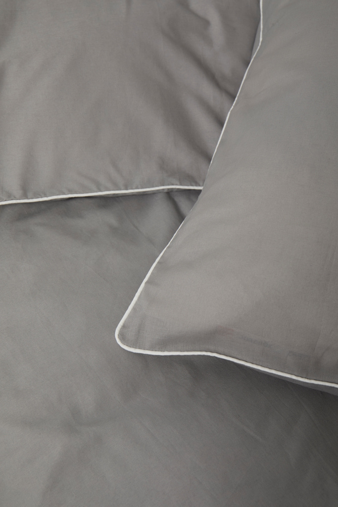 Bäddset i ekologiskt odlad bomull (OCS-certifierad). Detta eleganta set har en enfärgad design med pipingdetaljer i kontrastfärg längs med kanterna. Setet består av två örngott (50x60 cm) och två påslakan (150x210 cm) och ger din säng ett samordnat och elegant uttryck. Organic Content Standard (OCS) verifierar ekologiskt odlat material och spårar det från källa till slutprodukt. Denna produkt innehåller 98% OCS-certifierad ekologisk bomull.