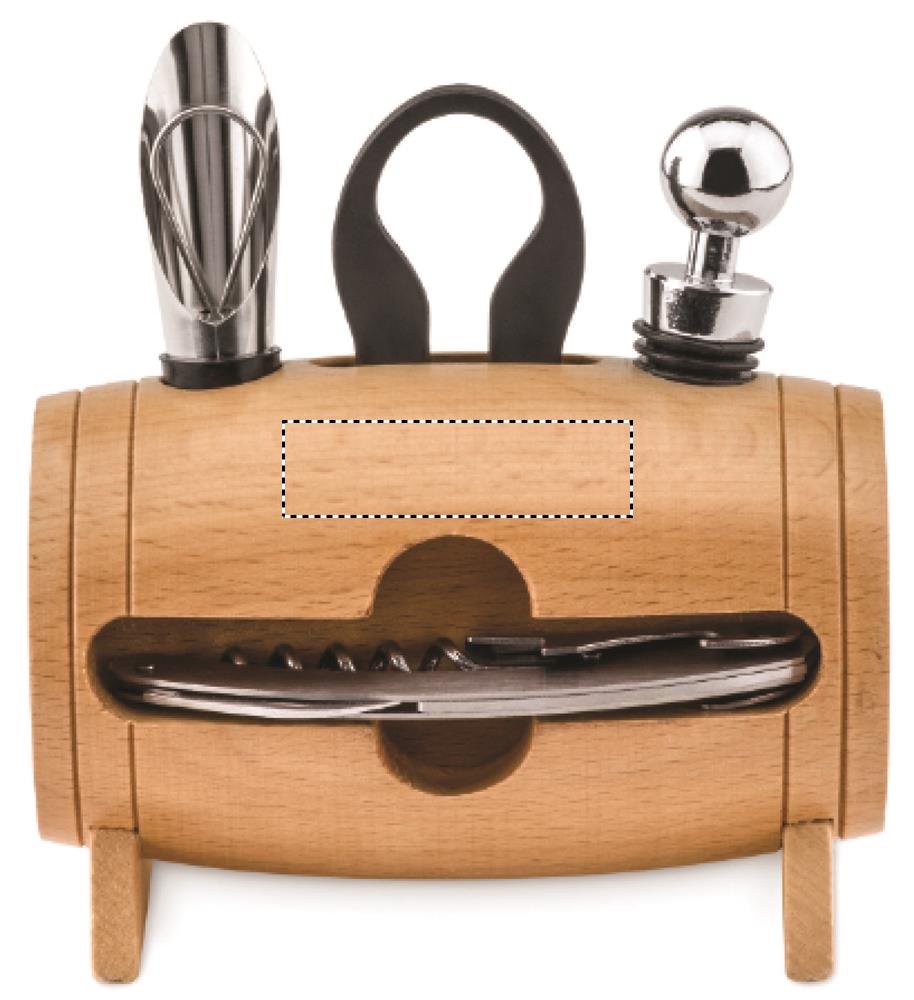 Vinställ i trä med 4 vintillbehör. Innehåller: servitörkniv, vinförslutare, vinhällare/dekanterare med stopp och folieskärare.
